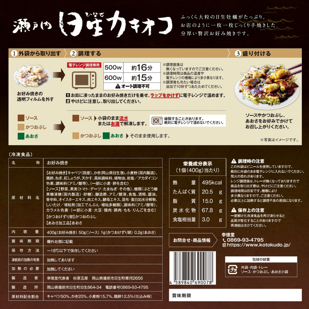 ひなせカキオコ ひなせカキオコ(冷凍400g 大判) 第29回グルメダイニングスタイルショー2021新商品大賞受賞 販売価格 1,620円(税込み) 会員価格 (税込み) 通常価格 (税込み) 在庫 商品コード 030 JANコード 4589840690078 数量 1 2 3 4 5 6 7 8 9 10 11 12 13 14 15 16 17 18 19 20 カートに入れる カテゴリー ひなせカキオコ メーカー 幸徳堂 ブランド ひなせかき 便種 宅急便冷凍 <内容量>大判・400g×1枚、お好み焼きソース(50g)×1袋、かつお節(1g)×1袋、あおさ(0.2g)×1袋<原材料名>【お好み焼き】キャベツ(国産)、かき(岡山県日生港)、小麦粉(国内製造)、鶏卵、ねぎ、紅しょうが、天かす、風味調味料、植物油、岩塩/アカダイコン色素、調味料(アミノ酸等)、(一部に小麦・卵を含む)【ソース】野菜、果実(トマト・デーツ・たまねぎ・その他)、糖類(ぶどう糖果糖液糖(国内製造)・砂糖)醸造酢、アミノ酸液、食塩、酒精、醤油、香辛料、オイスターエキス、肉エキス、酵母エキス、昆布・蛋白加水分解物、しいたけ/増粘剤(加工でんぷん・増粘多糖類)、調味料(アミノ酸等)、カラメル色素、(一部に小麦・大豆・鶏肉・豚肉・もも・りんごを含む)【かつおけずり節】かつおのふし【あおさ加工品】あおさ ツイートする シェアする RECOMMENDEDおすすめ商品 冷凍かき2l(むき身).日生かき 3,000円(税込み) みんな大好き!カキフライ(岡山県産 20粒) 1,400円(税込み) 牡蠣無双(日生かきのくん製オイル漬) 銀ラベル 1,404円(税込み) 牡蠣無双(日生かきのくん製オイル漬)金ラベル 1,404円(税込み) ひなせ岩牡蠣1kg<4~6粒>(生食用・殻付き) 3,240円(税込み) ひなせ岩牡蠣2kg<8~12粒>(生食用・殻付き) 6,480円(税込み) 殻付きかき(加熱用) 6.5キロ(軍手、ナイフ付) 8,532円(税込み) 殻付きかき(加熱用)、3キロ【軍手、ナイフ付】 4,212円(税込み) 日生かき むき身800g水入(生食用) 2,322円(税込み) 日生かき円盤500g特大(生食用) 2,322円(税込み) 大袋(むき身800g水入り・生食用)と殻付きかき(2kg加熱用)のセット(軍手、ナイフ付) 5,292円(税込み) 特大カキバラ(加熱用 1kg) 3,456円(税込み) 岡山日生かきフライ(日生産かき20粒) 3,240円(税込み) ひなせお取り寄せ市場 2025年11月 日 月 火 水 木 金 土 1 2 3 4 5 6 7 8 9 10 11 12 13 14 15 16 17 18 19 20 21 22 23 24 25 26 27 28 29 30 2025年12月 日 月 火 水 木 金 土 1 2 3 4 5 6 7 8 9 10 11 12 13 14 15 16 17 18 19 20 21 22 23 24 25 26 27 28 29 30 31 2026年01月 日 月 火 水 木 金 土 1 2 3 4 5 6 7 8 9 10 11 12 13 14 15 16 17 18 19 20 21 22 23 24 25 26 27 28 29 30 31 2026年02月 日 月 火 水 木 金 土 1 2 3 4 5 6 7 8 9 10 11 12 13 14 15 16 17 18 19 20 21 22 23 24 25 26 27 28 商品発送お休み日 ショッピングガイド 特定商取引法に基づく表記 個人情報保護方針 送料について 会員規約 お問い合わせ